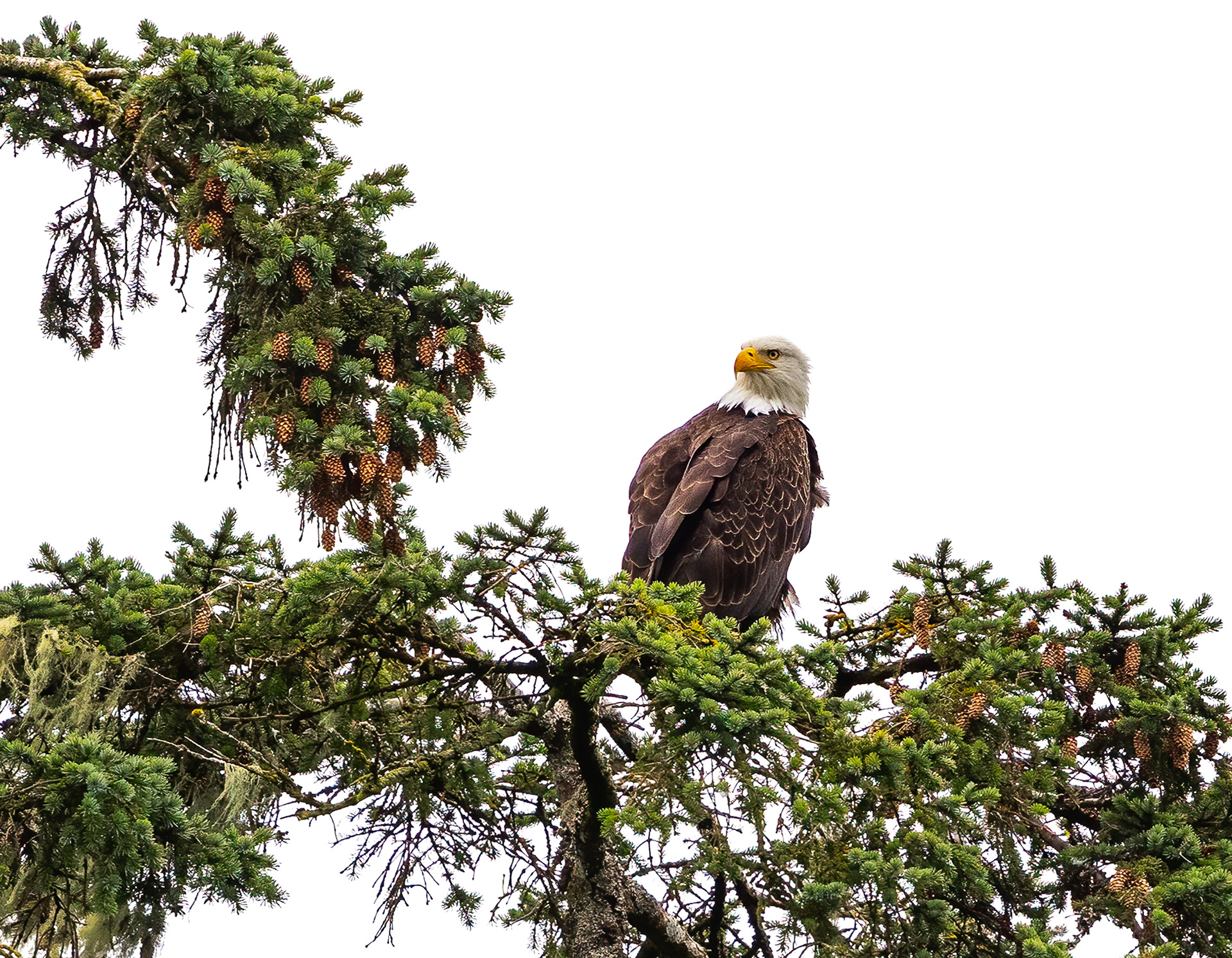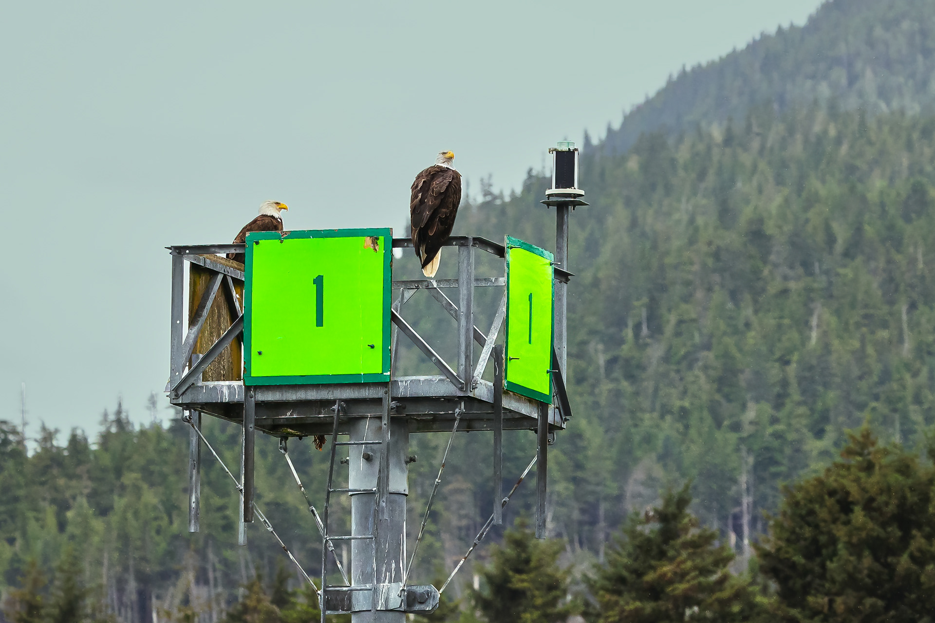 Returning to the home port from a whale‑watching excursion, more eagles were seen, surveying the harbor from a tower. Alaska holds the largest population of bald eagles in North America — a fitting reminder of the wild abundance that defines this place
