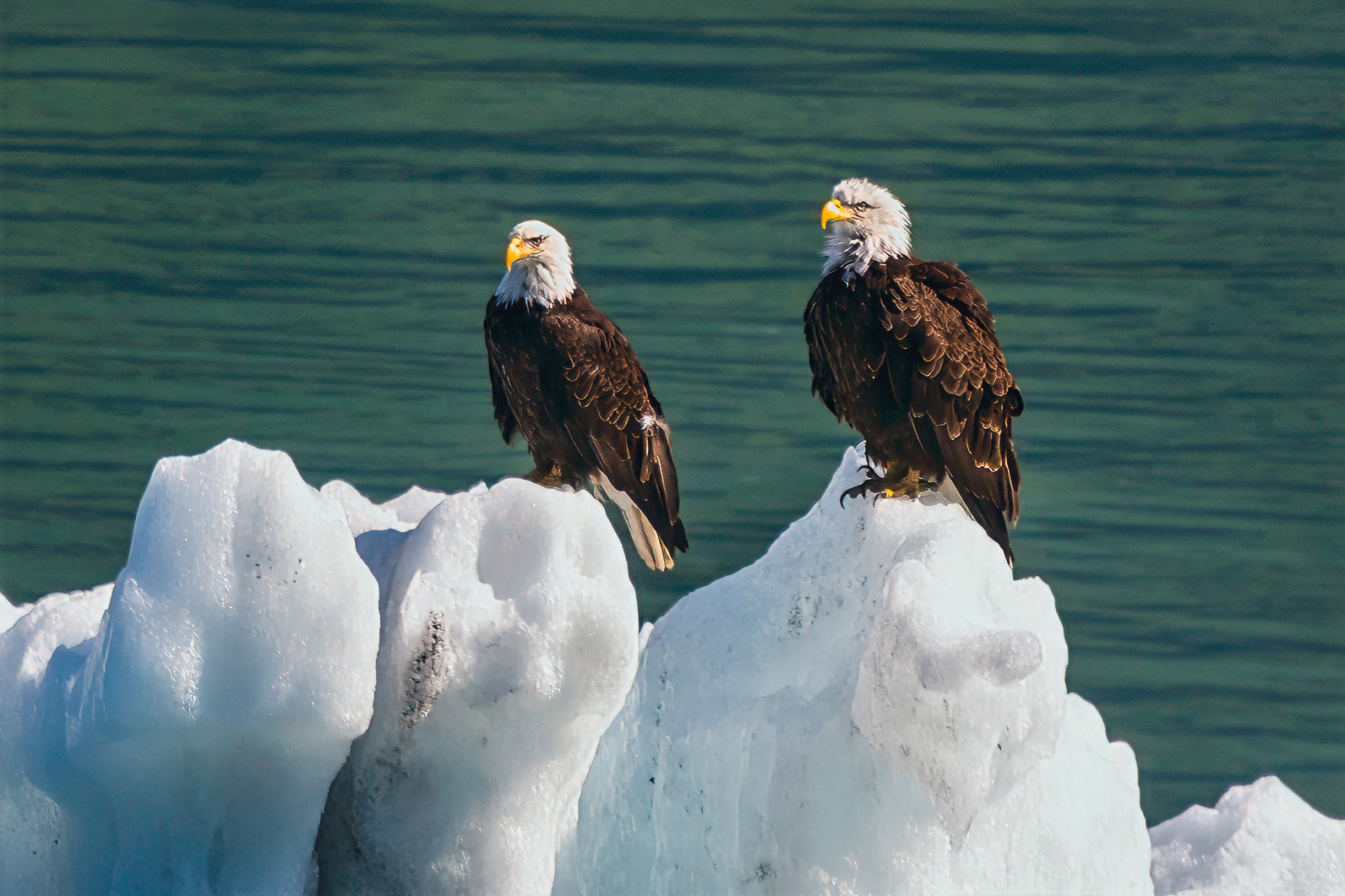 Later in the week, as the cruise ship pressed forward en route to a glacier, two more eagles appeared. They stood on calved ice, striking figures against the drifting floes. From their perch, they surveyed the shifting plain of floes carried downstream, scanning for their next meal.