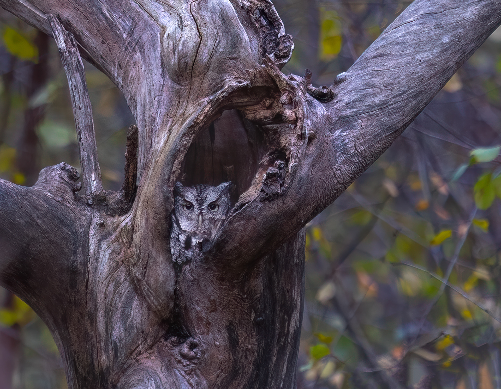 The first time, a passerby noticed my long lens and told me an owl was perched ahead. I scanned the trees, searching cavities and branches, until I spotted a likely roost. The tree stood well off the path, so I raised my camera to check. Through the lens, I saw him — a quick shot in my excitement. Reviewing the image, I realized auto ISO had jumped to 25,600. A record shot, nothing more. By the time I adjusted settings, he had slipped back into his hole.