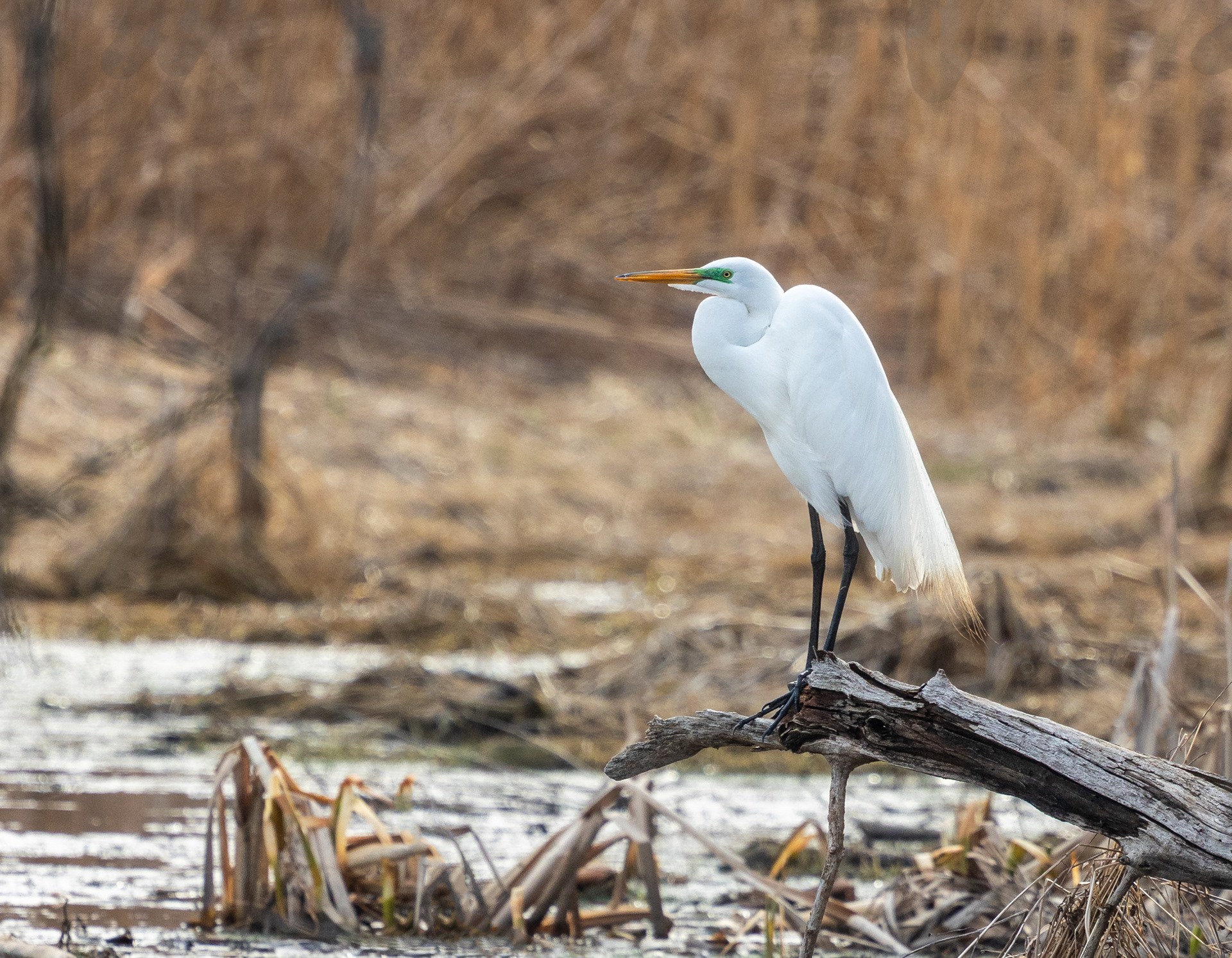 The elegance of the Great Egret during the breeding season, its transformation is nothing short of magical—the facial skin glows a vivid neon green, and delicate ornamental plumes, known as aigrettes, cascade from its back.