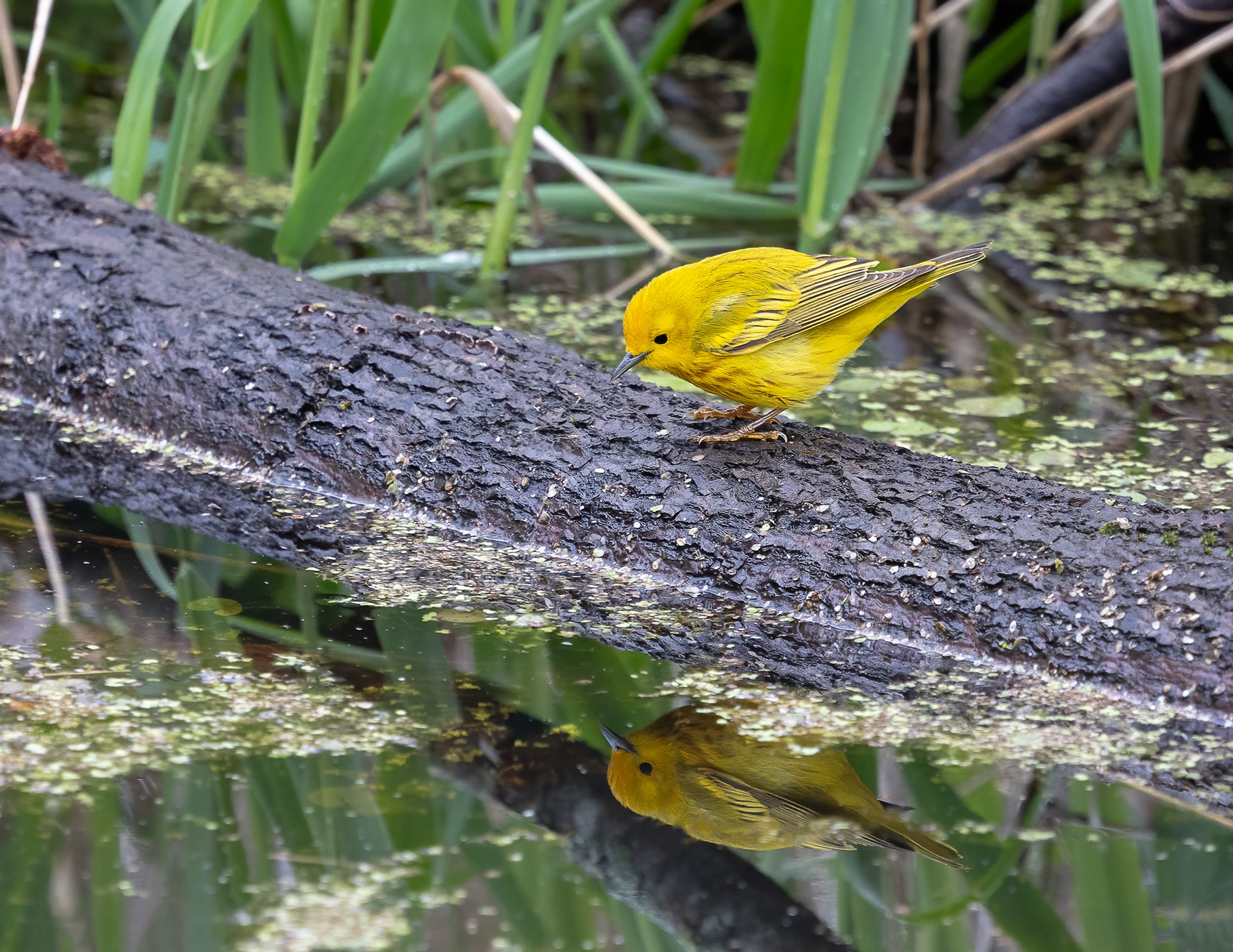 A Yellow Warbler broke briefly from his song and territorial patrols, gliding down from a nearby bush to sip from the stream.