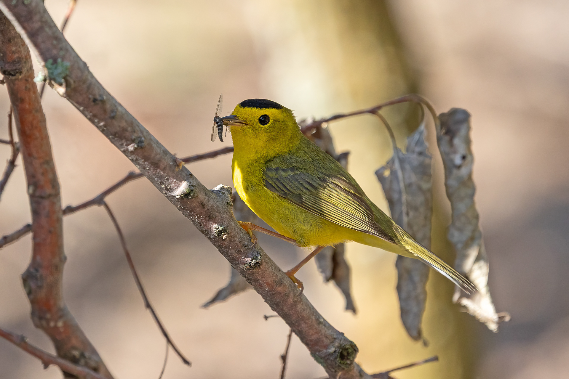 Insects moving along the branches of the thicket lured a Wilson’s Warbler from cover. He slipped out from the safety of the dense brush, drawn into the open by the promise of a quick meal.