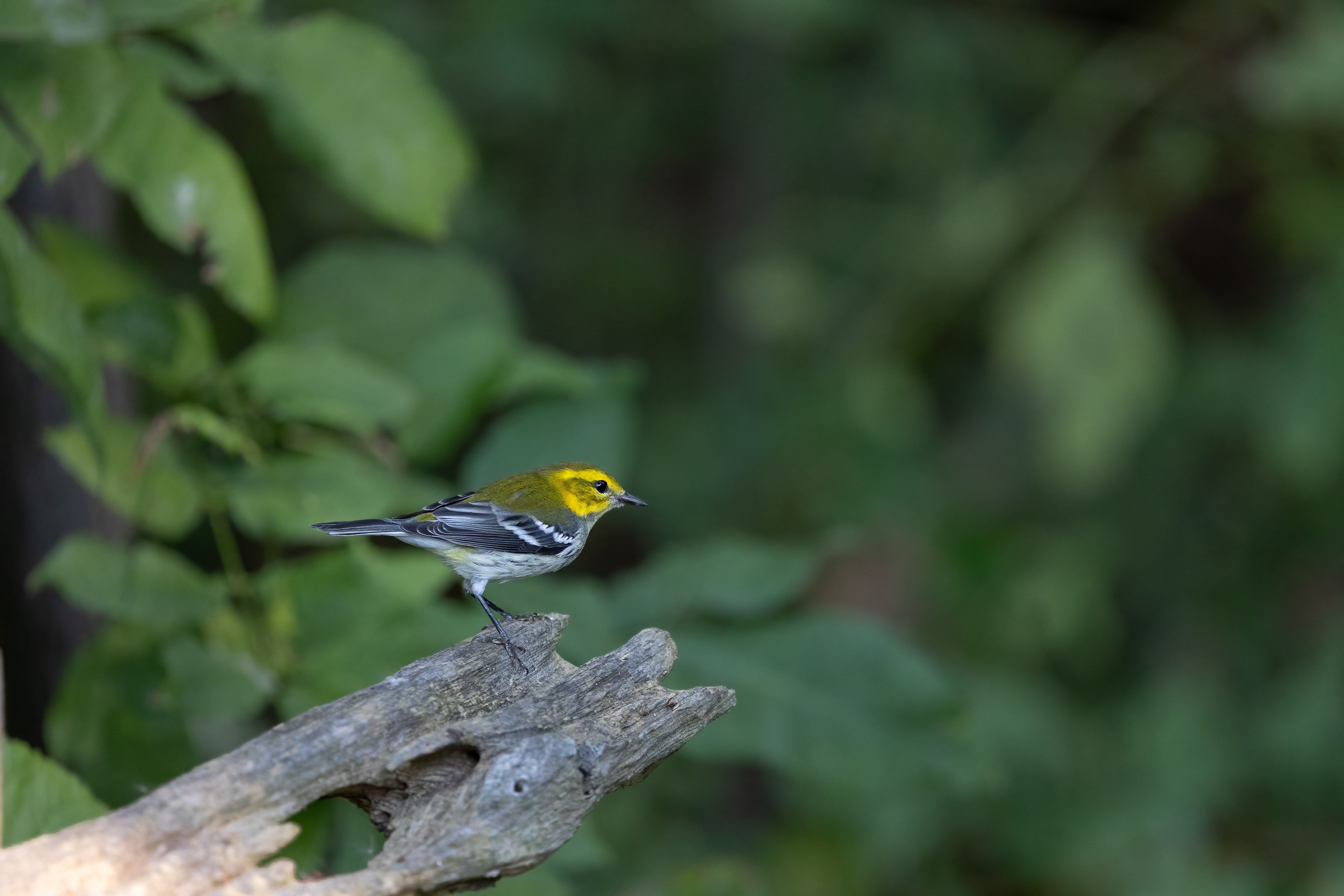 A Black-throated Green Warbler pauses on a perch, scans his surroundings with watchful ease. Moments later he descends to the pond, to bath in the babbling waters rushing over the rocks.